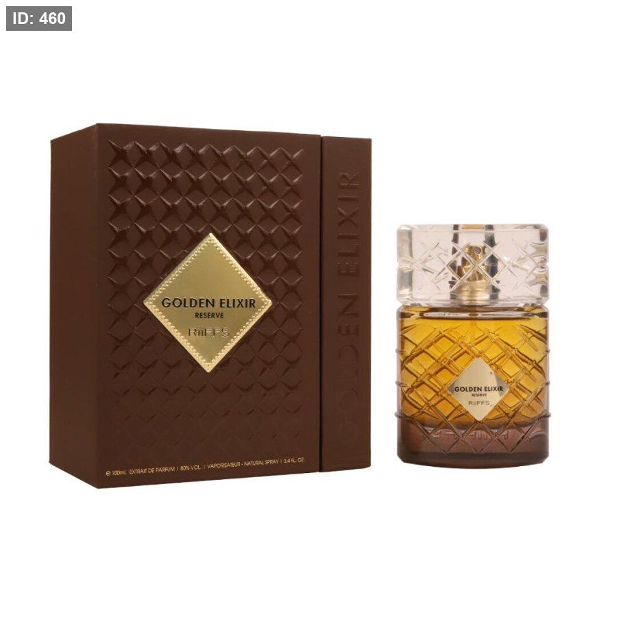 Golden Elixir Reserve Riiffs Perfumes عطر شرقي - حار للجنسين. هذا عطر جديد Golden Elixir Reserve صدر عام 2024. إفتتاحية العطر القرفة, الكونياك, القهوه و الهيل; قلب العطر حبوب التونكا, حلوي اللوز و التمر/البلح; قاعدة العطر تتكون من الفانيليا, العود و المسك.