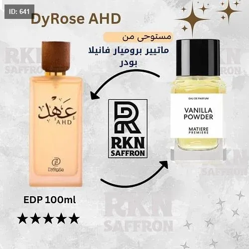 Ahd Dyrose عطر شرقي - خشبي للرجال . هذا عطر جديد Ahd صدر عام 2024. إفتتاحية العطر بودرة جوز الهند و الهيلوتروب; قلب العطر فانيليا مدغشقر; قاعدة العطر تتكون من الفانيليا, لاكتونات, جوز الهند, المسك الأبيض, بالو سانتو و المسك.
